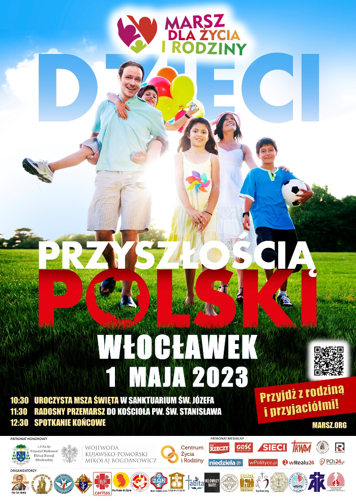 Marsz przejdzie ulicami Włocławka w poniedziałek 1 maja 2023 r. pod hasłem:„DZIECI PRZYSZŁOŚCIĄ POLSKI”.